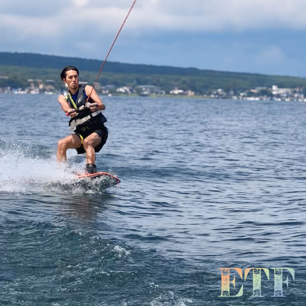 2日目は、山梨県の美しい山中湖でウェイクボードの体験が行われました。